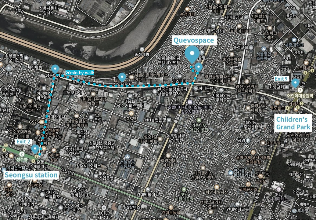 The Best Way to Connect: Seongdong-10 Maeul Bus" "For a truly local experience, take the Seongdong-10 maeul bus. It is the most convenient way to travel between the heart of the Seongsu area & QUEVOSPACE. It saves you the long walk and drops you right in the middle of the neighborhood's most popular spots!"