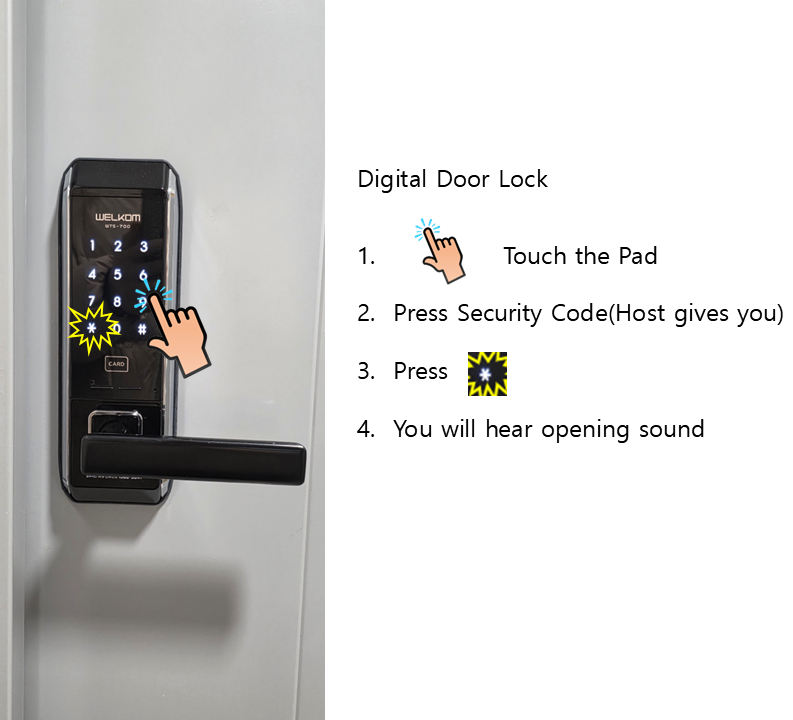 Most digital door locks in Korea operate by touching the screen first, entering the security code, and then pressing the star symbol (*) to unlock.