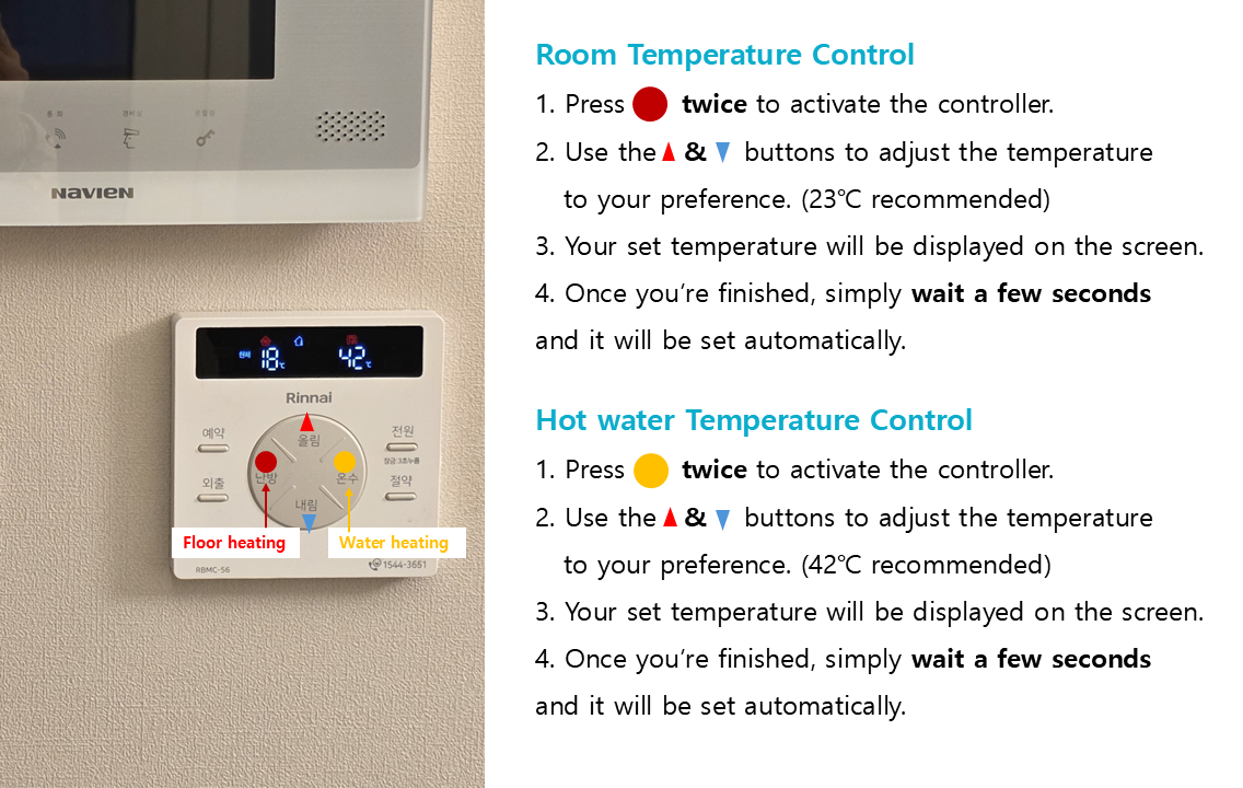 Before your arrival, the host sets the floor heating and hot water to the most comfortable temperatures. Generally, there is no need for guests to adjust these settings. However, if you would like to change them to suit your preference, please follow the instructions shown in the diagram up there.
