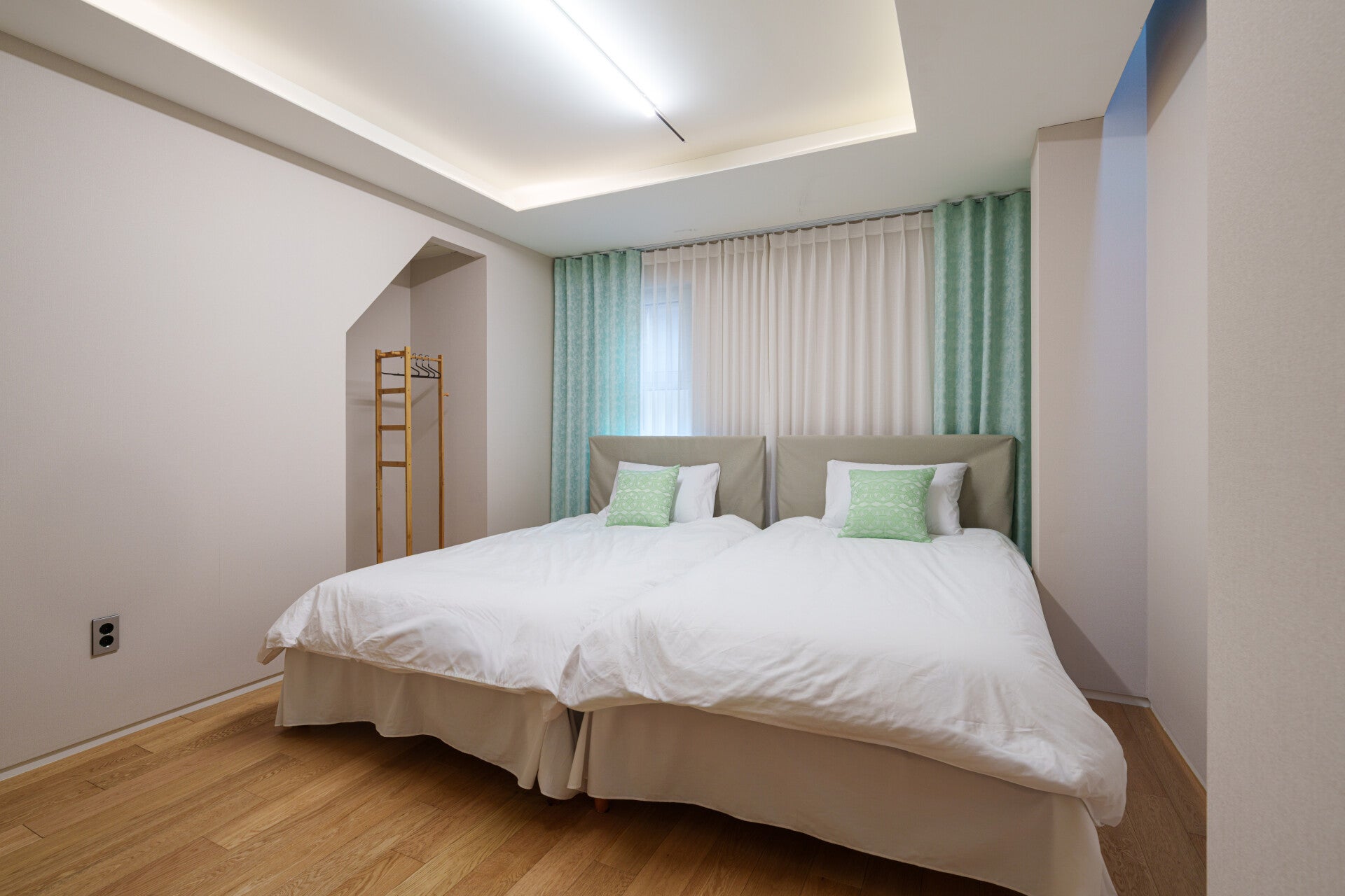 Two queen-size bedrooms feature exclusive, custom-designed patterns and color palettes created by our fabric designer—offering guests a one-of-a-kind spatial experience found nowhere else. Each room reflects a harmonious balance of texture, tone, and architectural intent.